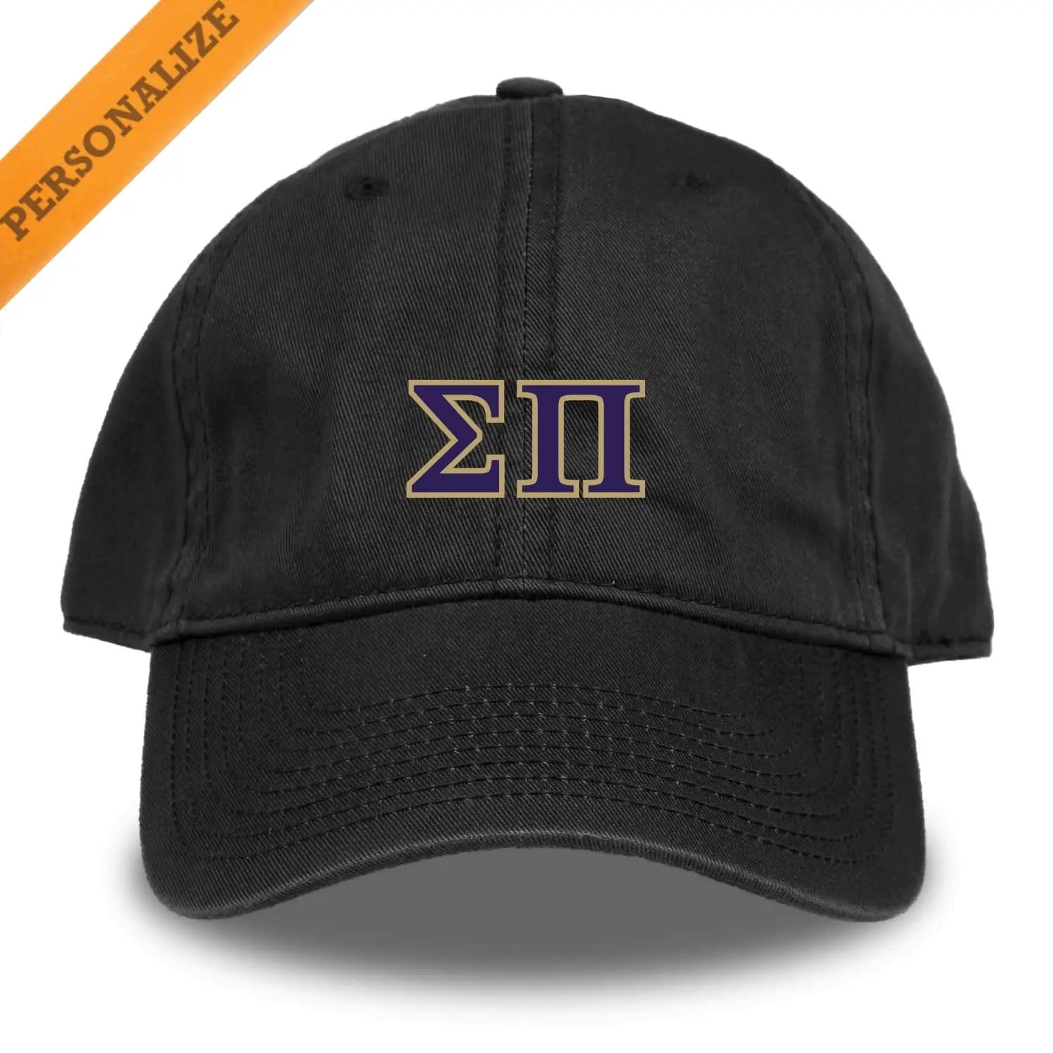 Nothing beats a black ball cap that is personalized with your name or chapter! With Sigma Pi's colors representing your Greek letters embroidered on a classic black cap, this relaxed hat will soon become your go to for any occasion. Made from garment washed twill and features adjustable slide buckle closure. This Sigma Pi Black Hat is sure the have all of your fraternity brothers envious of your impeccable style.