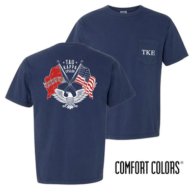 A bestseller tee, now in available as short or long sleeve! Celebrate frat and country with our TKE Patriot tee. Featuring Tau Kappa Epsilon's flag waving alongside the American flag, this tee will keep you proud for any event. Choose your best option in either short or long sleeve pocket tee! 100% preshrunk cotton. *Please Note: Comfort Colors shirts have a loose, unisex fit.
