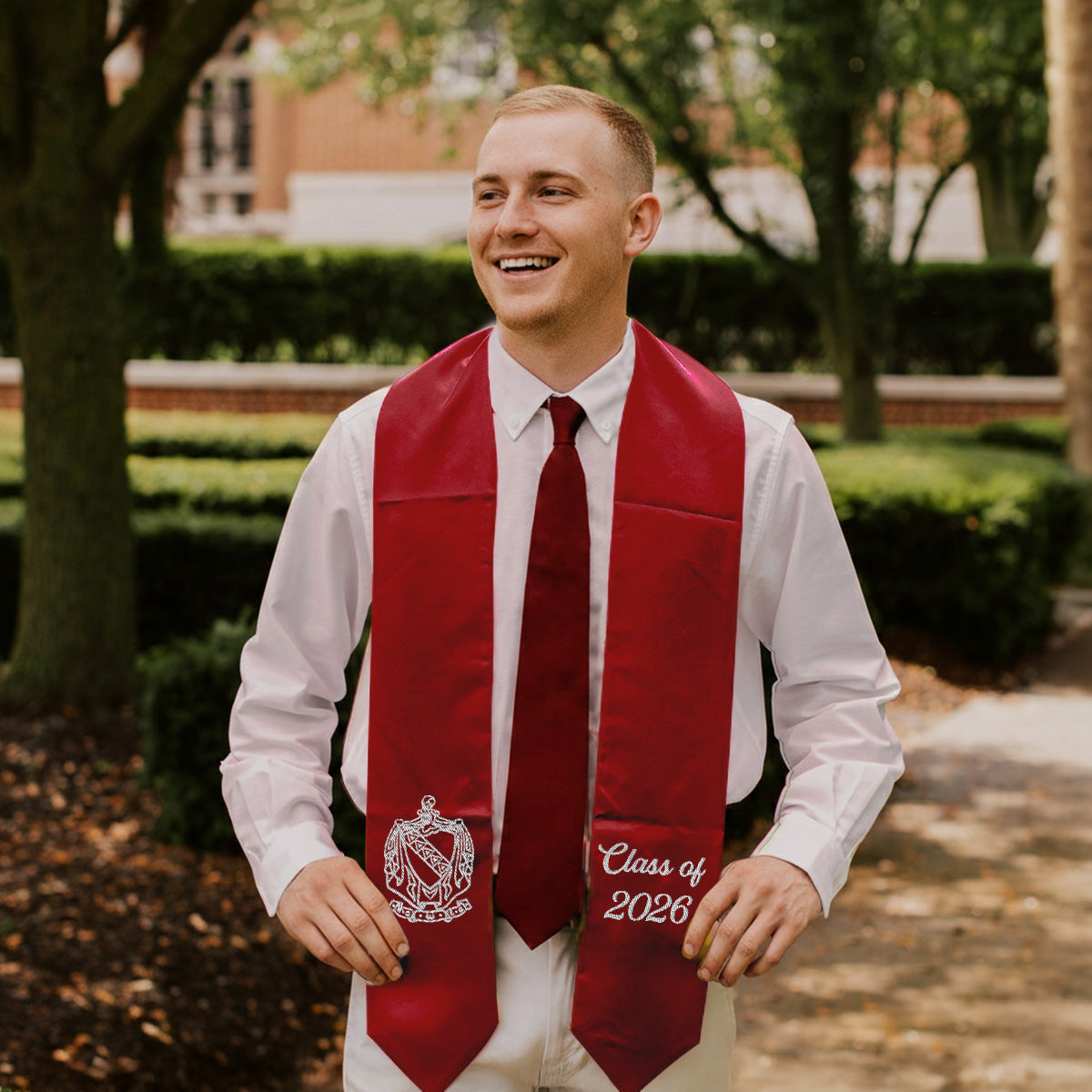 Be graduation ready in this TKE embroidered stole. This traditional and classic design features Tau Kappa Epsilon's crest and colors and graduation year, helping to make that diploma hand off one to remember.
