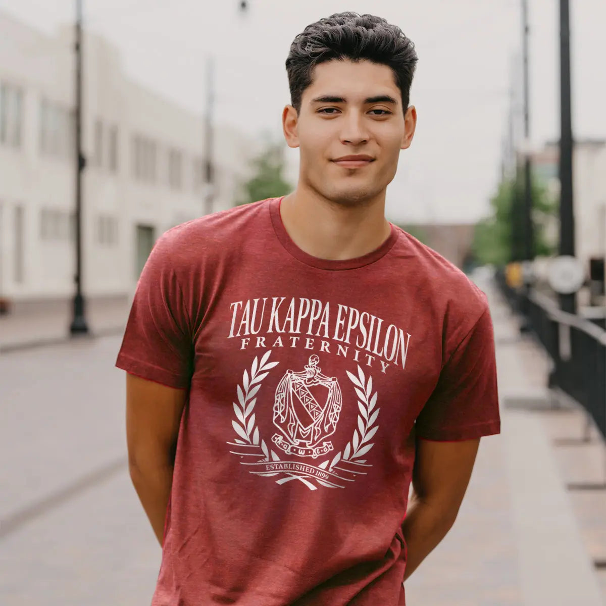This TKE tee blends a classic collegiate design with modern comfort. Printed on a premium cotton-poly blend tee, it features Tau Kappa Epsilon's official crest framed by bold typography and traditional laurel elements. The fabric is ultra-soft and breathable with a modern, athletic fit. Whether you're headed to a chapter event or just hanging out, this tee is an easy go-to.