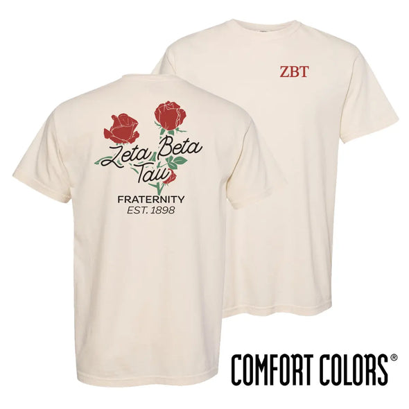 This ZBT Rosebud Comfort Colors t-shirt has everything you need. Featuring a rosebud design on an ivory tee, this 100% ring spun cotton Comfort Colors shirt lets you show your Zeta Beta Tau pride in casual comfort.