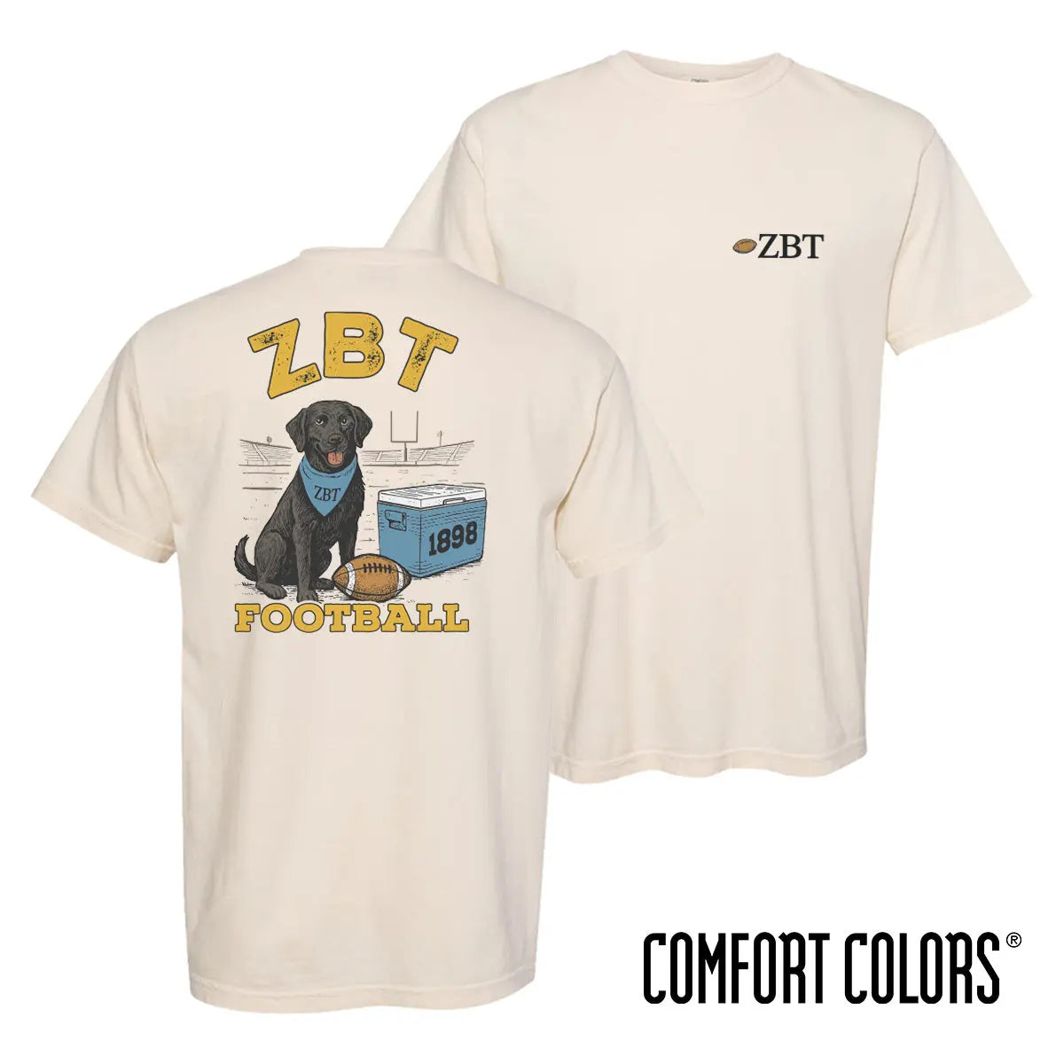 The Linebacker Lab Short Sleeve Tee is a playful nod to tradition, tailor-made for ZBT. Front and center, a game-day-ready black lab decked out in a for recruitment, this Zeta Beta Tau bandana sits proudly in front of the goalposts, guarding a classic cooler stamped with your founding year and a well-worn football by its side. The hand-drawn artwork brings a nostalgic, vintage-inspired feel, capturing the energy of fall Saturdays and brotherhood pride. Whether you're repping your fraternity on campus, at homecoming, or just around town, this tee brings together timeless style and fraternity spirit in one standout piece.